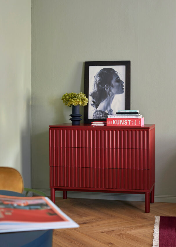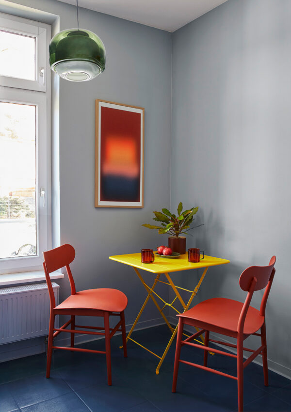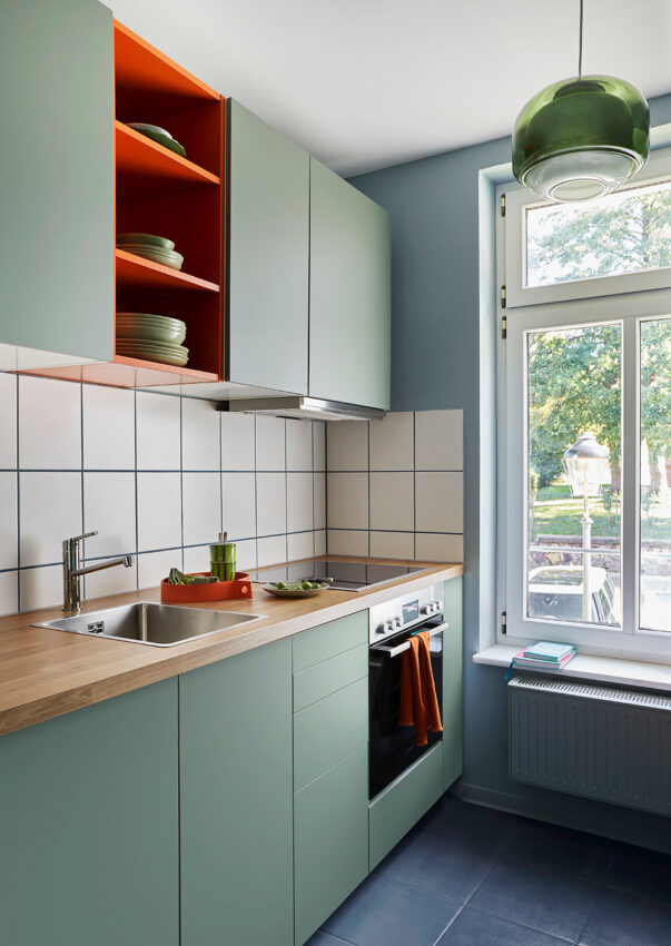 Farbe als Leitidee, Raffinesse als Prinzip: Das kleine Budget erforderte durchdachte Kombinationen aus Vintage-Stücken und fein kuratierten Möbeln von der Stange. Für diese Wohnung sollte ich ein Interior entwerfen, das Klasse, Farbigkeit und Kunst vereint. Dunkles Indigoblau, warmes Pistaziengrün und rostiges Orange ziehen sich, ergänzt von samtigem Burgunderrot, durch Möbel, Bilder und Wände. Kunst ist dabei weit mehr als Dekoration: Sie setzt starke Akzente.